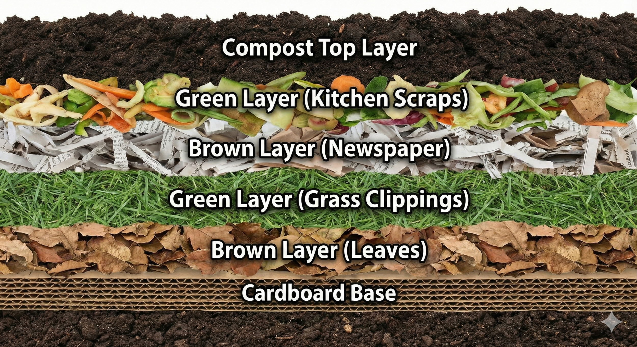 Brown Materials: Dried leaves, straw, cardboard, shredded newspaper, wood chips.