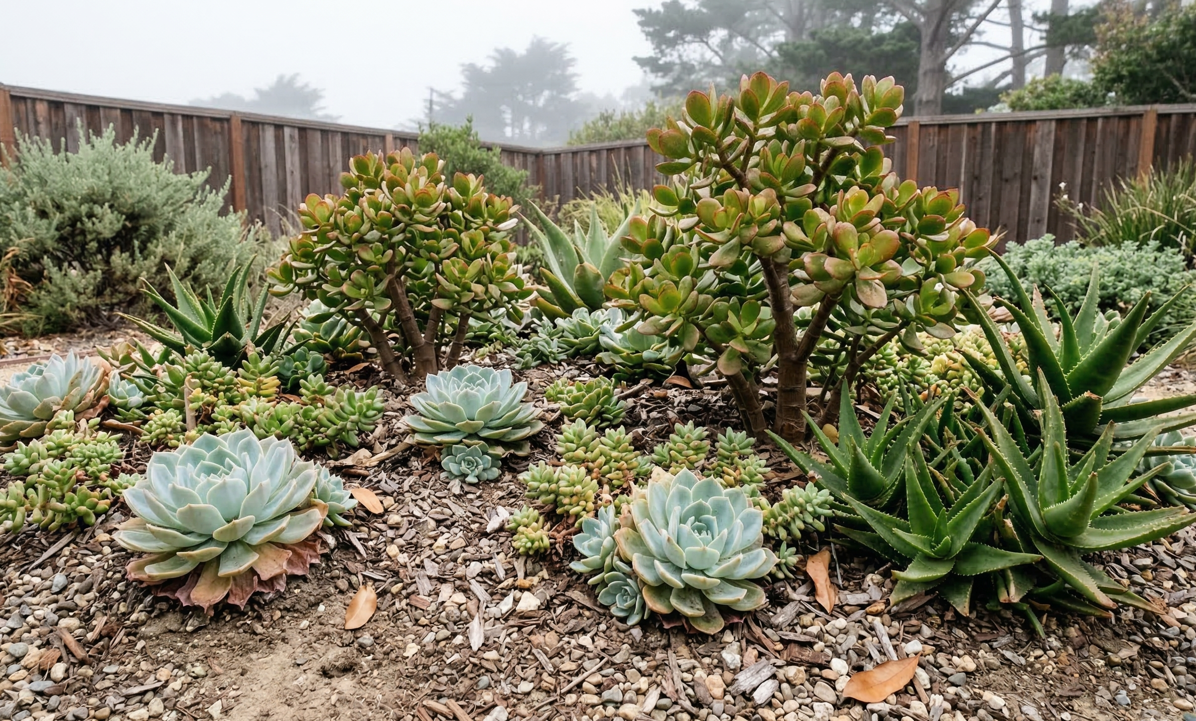 Choose fog-tolerant species. In the fog belt, grow Aeonium, Dudleya, Aloe arborescens, and Sedum rather than rot-prone species like Echeveria, thin-leaved Crassula, and desert cacti.
